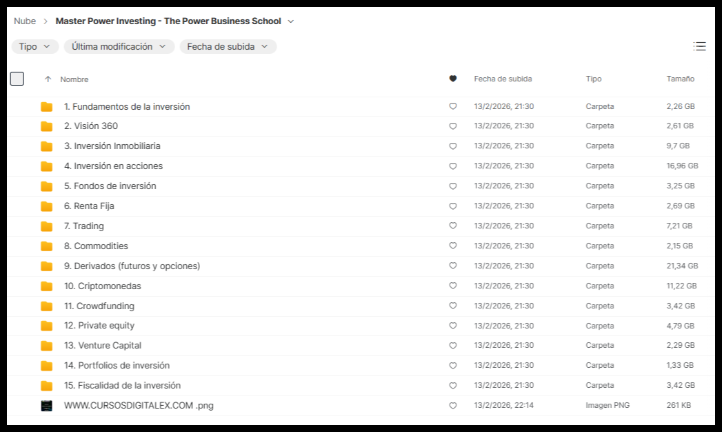 🎓 El Máster Power Investing de The Power Business School es un programa integral de educación financiera diseñado para personas que quieren tomar el control de su dinero 💰, aprender a invertir con seguridad 🛡️ y construir un patrimonio sólido 🏰 utilizando los mismos métodos que emplean los grandes inversionistas 🐂.